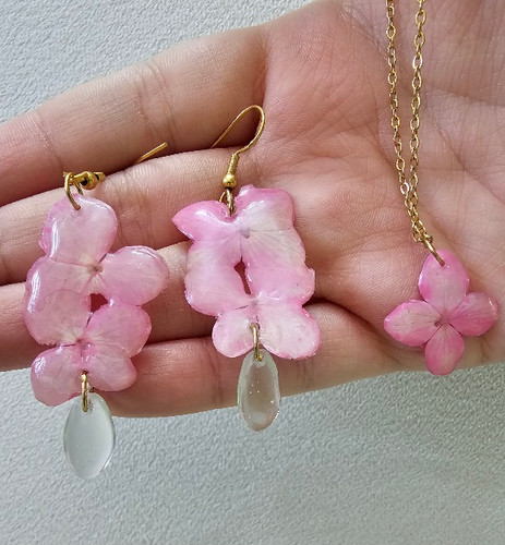 ست گوشواره و گردنبند رزینی طرح گل هورتانسیا